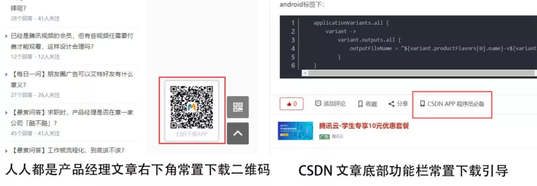 包括简书、人人都是产品经理、CSDN等内容网站都在首页设置了APP下载二维码入口,通常放置在banner 或者首页右下角、上方菜单栏中,建议可以作为网站必备功能长久放置。