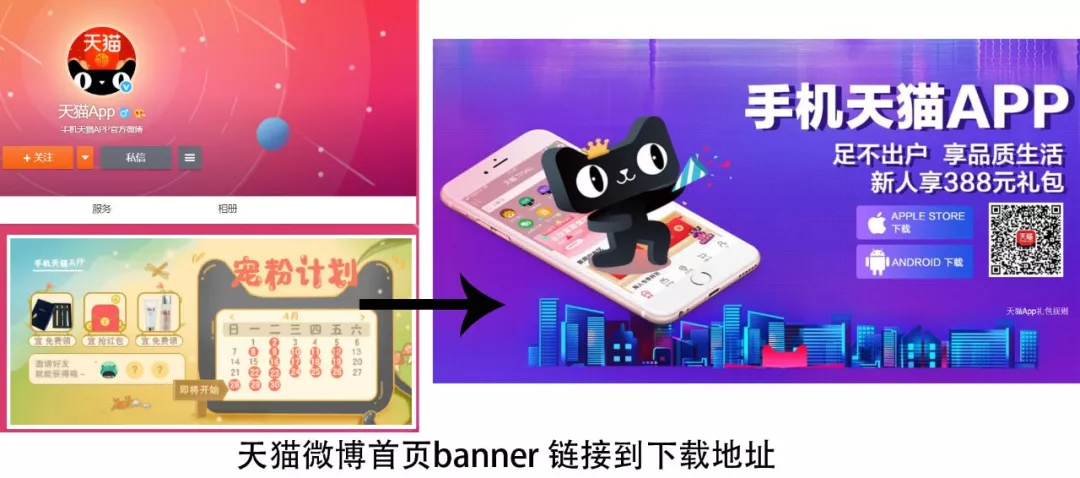 官方微博首页banner 可以作为长久的广告位,添加链接到相关APP下载或活动页面即可。通常来说如果信息比较多可以放置两张图轮流滚动播放,也可以考虑像天猫的做法——只放一张图,图片不滚动,让用户的精力集中到单页的内容上。