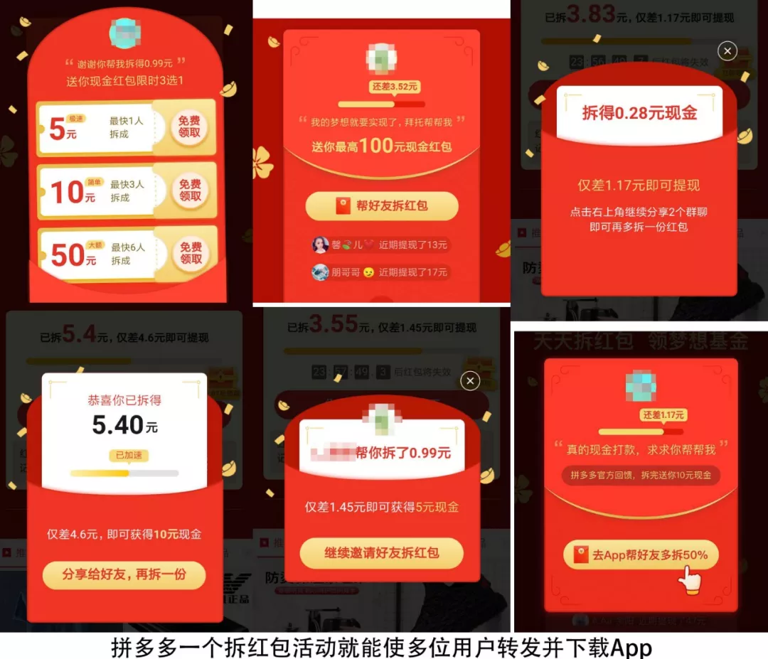 一种是以福利活动为名进行的短期推广,这种活动一般奖励力度大,借助微博、微信等社交平台,以及短信、广告等同步推广,以打造现象级爆款为推广目的,王者荣耀、拼多多、趣头条、饿了么等APP都曾用裂变推广的形式疯狂扩张。