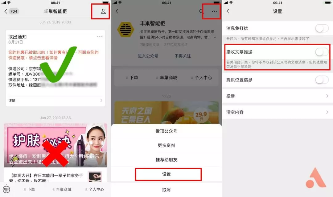 没有内测资格,如何实现手动「拒收」?操作很简单,进入公众号消息页面,点击右上角的小人,再点击右上角的「…」,进入「设置」页面,就可以看到「接收文章推送」的开关。值得一提的是,这个设置不仅适用于订阅号,设置「拒收」银行、快递、商超这些服务号文章效果更佳。
