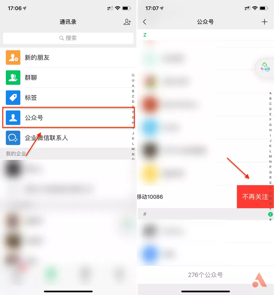 比如你关注了智能快递柜的服务号,平时只想用于接收取件通知,而不想去阅读其中的广告推文,那就可以对这个号设置「拒收」。因为这里的「拒收」只针对文章,对于模板消息免疫。如果你关注的公众号过多,或者实在想快速大量「取消关注」,那我们在这里也分享一个快速取关的小技巧。打开微信「通讯录」,选择「公众号」,即可进入订阅号管理页面。在这个页面里,你可以滑至页面底部,查看已经关注的公众号数量;也能实现公众号的快速取关:iOS 用户只需向左滑动想要取关的公众号名称,Android 用户长按名称即可出现「不再关注」按键。