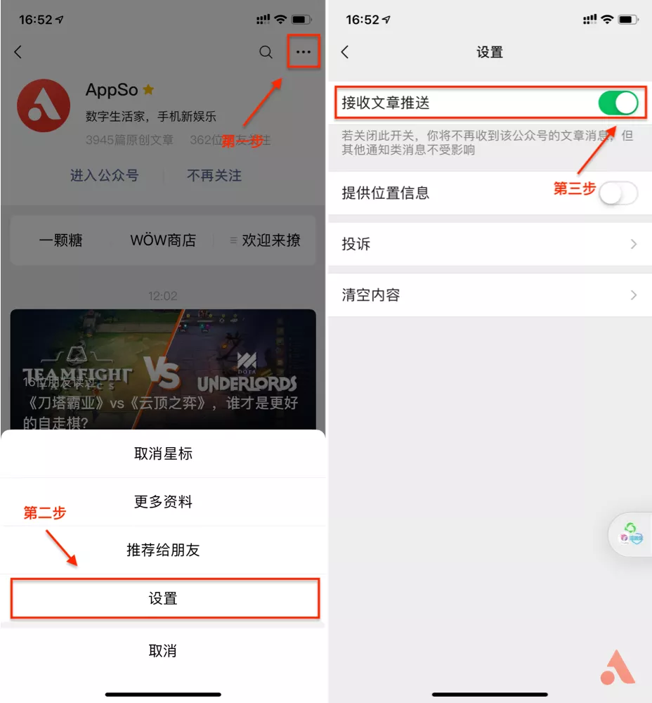 后悔了也可以恢复文章推送有的人在的时候没什么稀奇,但是一旦消失又觉得处处不得劲儿……也许公众号也是这样,如果你在「拒绝接收文章推送」后又后悔了,没关系,你可以重新恢复文章的推送功能。直接在顶部搜索公众号名称,进入公众号主页后点击右上角的「...」-「设置」,打开「接收文章推送」的开关就可以了。最后期待一下,「一键拒收消息」功能来了,「一键清理好友」功能还会远吗?